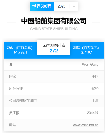 北京時間2023年8月2日,《財富》中英文網(wǎng)站同時發(fā)布2023《財富》世界500強排行榜,中國船舶集團有限公司以517.991億美元的營業(yè)收入位列全球榜單第272位,自2021年重組后首次申報以來連續(xù)三年上榜,蟬聯(lián)全球造船企業(yè)首位。