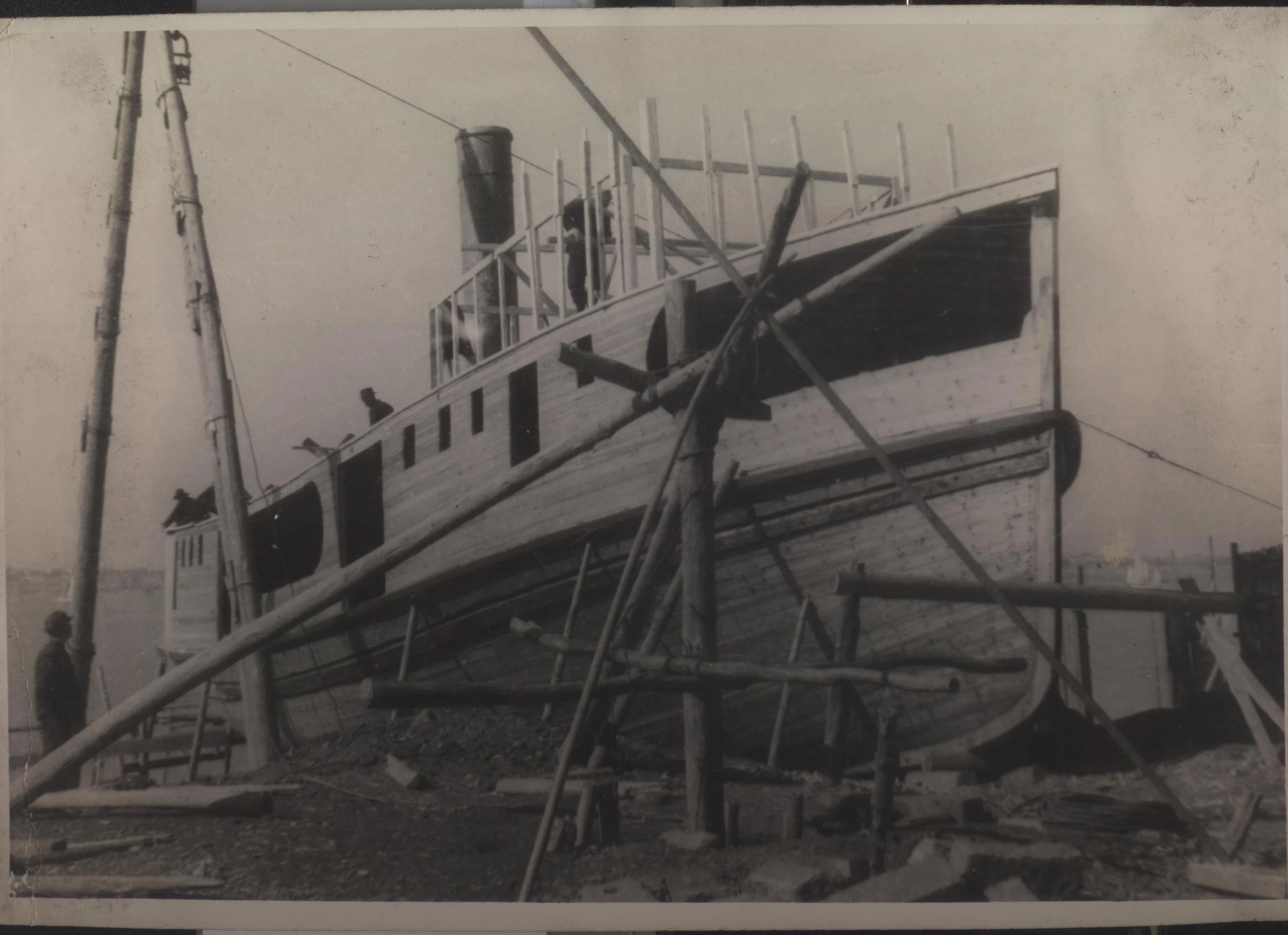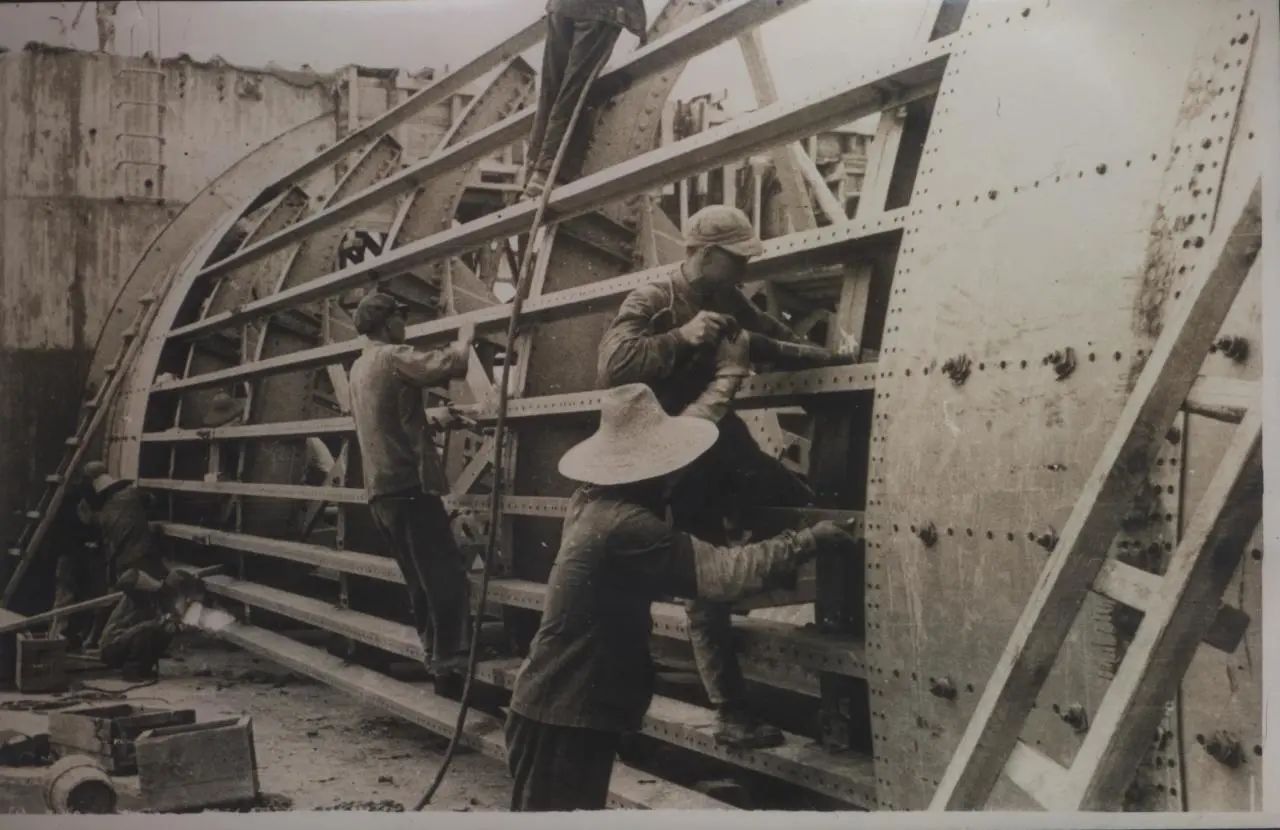 1934年武漢,上世紀30年代,武昌造船成立之初,工人們以手工作業(yè)“敲敲打打”形式開展修造船業(yè)務。修造的船只大多為100~300噸、鋼肋骨與木殼結構,僅有少量是鋼鉚接船體。建造的船只只能在長江上航行跑跑運輸。為了生存和救國,船廠還建造一些農用機械器具、槍支,以輔助民生、支援抗日。