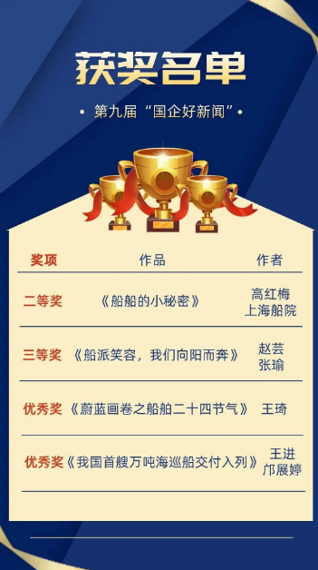 近日,第九屆“國企好新聞”獲獎作品正式揭曉,中國船舶集團斬獲4項大獎,涵蓋科普類、影音類、圖片類、文字類等多種體裁。其中,二等獎1項、三等獎1項、優秀獎2項。