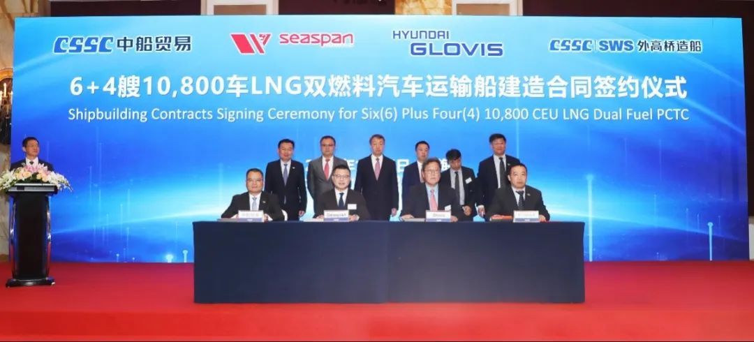 簽約儀式上,外高橋造船、中船貿易與Seaspan、現代Glovis簽署了6+4艘10800車LNG雙燃料PCTC船項目;廣船國際、中船貿易與HMM、現代Glovis簽署了6+4艘10800車LNG雙燃料PCTC船項目;北海造船、中船貿易與北銀金租、山東海運簽署了4艘325000噸超?型甲醇雙燃料礦砂船項目;江南造船、中船貿易與太平洋氣體簽署了3艘99000方VLEC船項目;黃埔文沖、中船貿易與Benelux公司簽署了2+1艘48000方LPG船項目;中船澄西、中船貿易與工銀金租簽署了4艘82600噸散貨船項目;大連造船與七二五所青島雙瑞簽署了15000TEU集裝箱船甲醇供應系統項目。