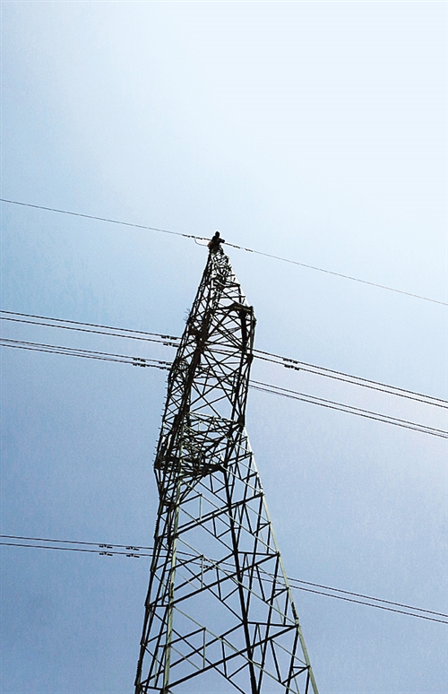 一名電工爬上一座電網(wǎng)塔基進(jìn)行檢修。這條331公里的輸電線路是新疆東南部且末縣和若羌縣10萬(wàn)多居民用電的主要憑借。