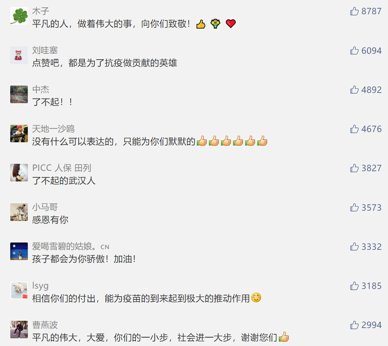 ????4月18日,人民日報微信公眾號推送了這樣一條消息,詳細介紹了一位土生土長的武漢人王璐及其家人自愿報名接種新冠疫苗的事跡,消息收獲了10萬+的閱讀量與3.2萬的“在看” ,還有動輒幾千的留言點贊!這位女主角王璐來自中國船舶集團七一七所,不同于第一批結束醫學觀察的志愿者,王璐所在組的年齡在20歲到50歲,是最早一批高劑量的接種者。
