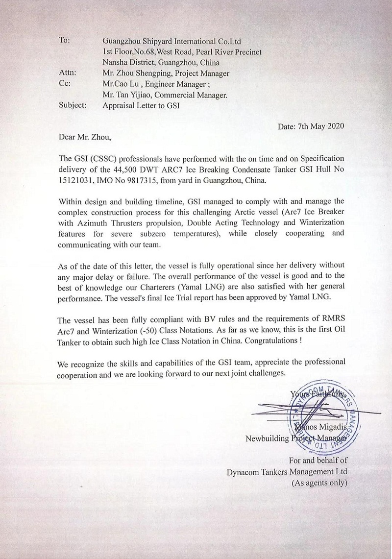 ????5月7日,中國(guó)船舶集團(tuán)旗下廣船國(guó)際收到了來自希臘Dynacom航運(yùn)公司的感謝信,信中贊揚(yáng)了廣船國(guó)際為其建造的極地凝析油船“BORIS SOKOLOV(鮑里斯索科洛夫)”號(hào)