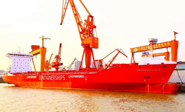 5月12日,黃埔文沖為法國達飛輪船集團建造的1400TEU雙燃料集裝箱“CONTAINERSHIPS STELLAR”號交付。