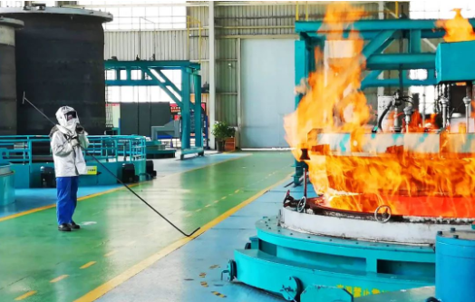重齒公司熱處理車間,熱處理工人面對著高達800多度的熱處理爐,不懼高溫火焰,確保產品高質量產出。