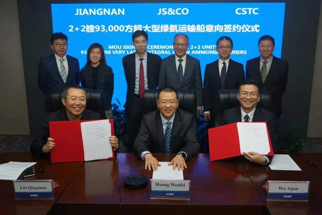 12月10日,中國船舶集團(tuán)旗下江南造船攜手貿(mào)易公司與JS & Co視頻簽署了2+2艘93000立方米超大型綠氨運(yùn)輸船(VLAC)合作備忘錄。