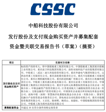 10月10日,中國船舶集團有限公司旗下上市公司中船科技股份有限公司發布《發行股份及支付現金購買資產并募集配套資金暨關聯交易報告書(草案)》等公告。根據公告,中船科技擬通過發行股份及支付現金的方式購買交易對方持有的交易作價合計約為91.98億元的標的資產,并擬非公開發行股票募集不超過30億元的配套資金。該草案的公布標志著中船科技重大資產重組取得具有里程碑意義的重要進展。