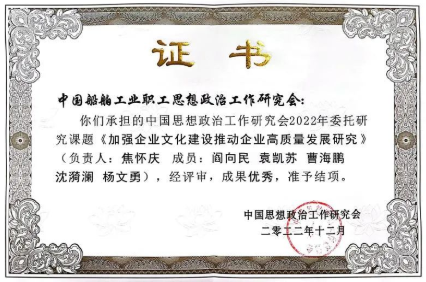 近日,由中國(guó)船舶工業(yè)職工思想政治工作研究會(huì)申報(bào)的中國(guó)思想政治工作研究會(huì)2022年委托課題《加強(qiáng)企業(yè)文化建設(shè),推動(dòng)企業(yè)高質(zhì)量發(fā)展研究》評(píng)審結(jié)果公布,成果優(yōu)秀,報(bào)經(jīng)中央宣傳部領(lǐng)導(dǎo)審定準(zhǔn)予結(jié)項(xiàng)。這是中國(guó)船舶政研會(huì)首次承擔(dān)中國(guó)政研會(huì)委托課題并獲評(píng)優(yōu)秀。