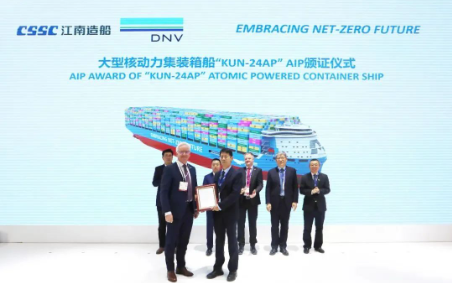 全球首型、世界最大24000箱核動(dòng)力集裝箱船船型發(fā)布,挪威船級(jí)社(DNV)頒發(fā)了該船型的原則性認(rèn)可證書。