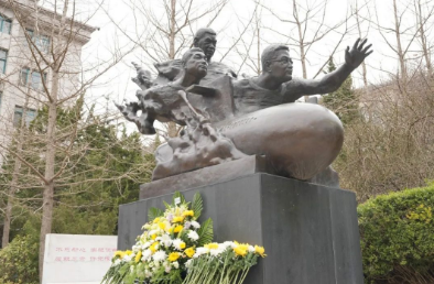 在時代楷模·抗災搶險英雄雕像前默哀