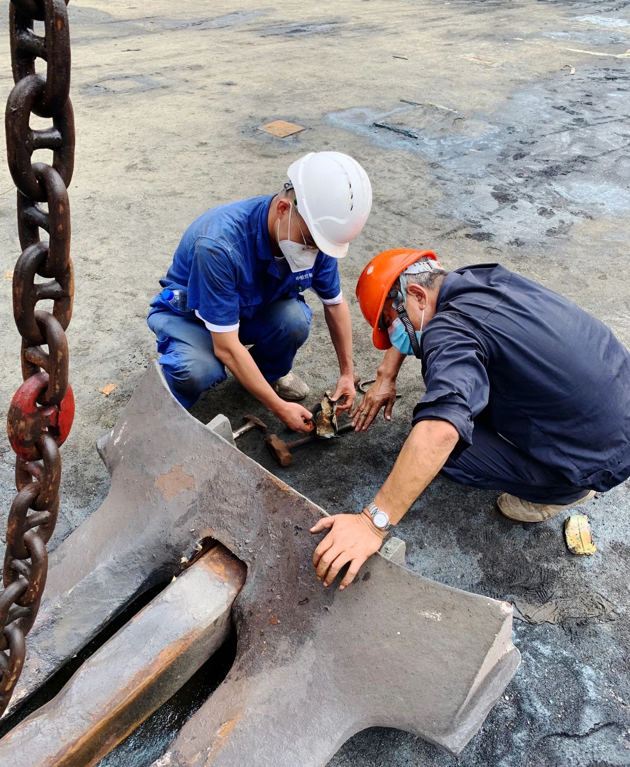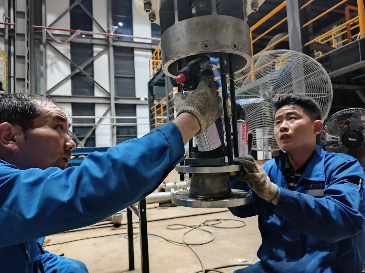 七二五所——雙瑞精鑄鈦板帶車間的師傅們正頂著酷暑進行修復裝配面工作。