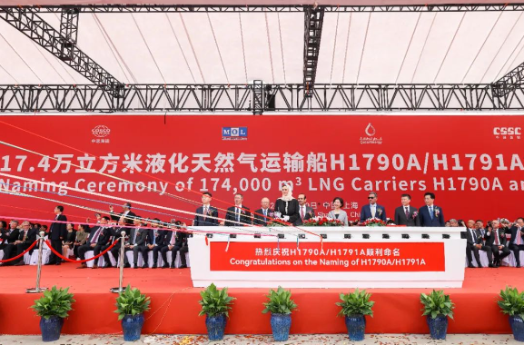 9月10日,中國船舶集團旗下滬東中華聯合中船貿易與卡塔爾能源液化天然氣公司,為“卡塔爾百船建造計劃——卡塔爾北部氣田擴能船舶購置項目”17.4萬立方米大型LNG運輸船首船“雷克斯·蒂勒森”號、2號船“烏姆·古瓦伊琳娜”號舉行命名儀式??ㄋ柲茉词聞諊鴦沾蟪?、卡塔爾能源總裁兼首席執行官薩阿德·謝里達·阿爾卡比,中國船舶集團黨組成員、總會計師賈海英等出席命名儀式。