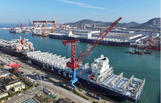 12月3日,中國船舶集團青島北海造船與中船貿易作為聯(lián)合賣方,為達飛海運建造的系列5500TEU集裝箱船“CMA CGM KAURI”號舉行命名交付儀式。該船是北海造船交付的第8艘5500TEU集裝箱船,也是北海造船年度交付的第19艘船。