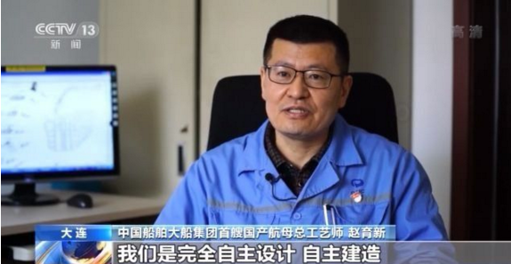 中國(guó)船舶大船集團(tuán)首艘國(guó)產(chǎn)航母總工藝師 趙育新:從第一次海試到最后交付,在這一年半的時(shí)間里沒(méi)有休息的,連軸(日以繼夜)地在這個(gè)工程上,一起拼搏。
