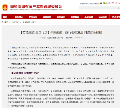 【編者按】6月13日,第32個全國節(jié)能宣傳周開啟。節(jié)能是生態(tài)文明建設(shè)的重要內(nèi)容,是推進(jìn)碳達(dá)峰碳中和、促進(jìn)高質(zhì)量發(fā)展的重要支撐。中央企業(yè)努力爭當(dāng)能源清潔低碳轉(zhuǎn)型的推動者、先行者、引領(lǐng)者,“十三五”期間,央企能源消費(fèi)總量、碳排放總量得到有效控制,能源消耗強(qiáng)度、碳排放強(qiáng)度、主要污染物排放總量持續(xù)大幅下降。6月16日,國資委網(wǎng)站在“節(jié)能減碳 央企行動”系列報(bào)道中,展示中國船舶集團(tuán)有限公司促進(jìn)社會綠色低碳的生動實(shí)踐。