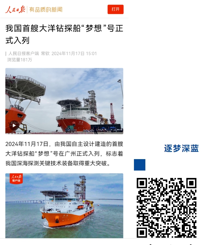 11月17日,中國船舶集團自主設計建造的我國首艘大洋鉆探船“夢想”號在廣州南沙交付入列,人民日報、新華社、央視等媒體的記者來到交付現場進行報道 。