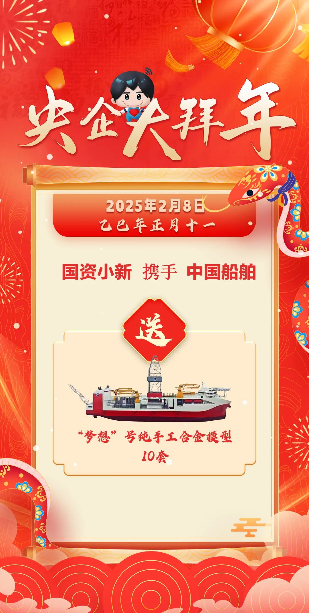 今天“國資小新”聯合中國船舶抽取10位幸運粉絲,送上“夢想”號純手工合金模型。