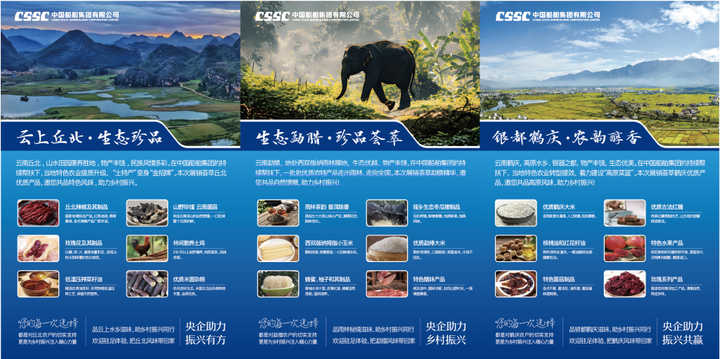 百家央企聚合力,消費幫扶促振興。中船集團積極響應國家號召,自2018年起持續對云南鶴慶、丘北、勐臘三縣開展消費幫扶,通過“以購代扶、以銷促產”的有效路徑,走出了鄉村振興的堅實步伐。同時,中船集團以“中船集團電子商城”“中船·惠民優選”線上平臺為依托,充分挖掘并推廣三個幫扶縣特色農產品資源,系統推進消費幫扶工作落地落實。